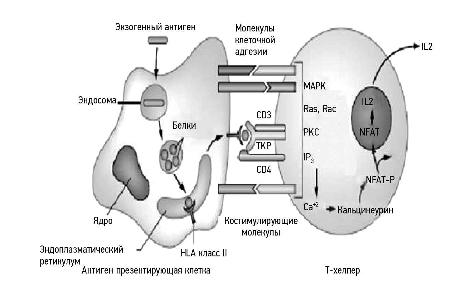 Стимуляция Т-клеток приводит к фосфорилированию цитоплазматической области комплекса CD3 и это активирует несколько внутренних путей трансдукции сигнала, особенно инозитол трисфосфат (IP3)/протеин киназа С (PKC)/митоген активированный белок (MAP) и обмен белков Ras и Rac семейства гуанозитрифосфата (GTP). Важным этапом конечной трансдукции сигнала является повышение внутриклеточной концентрации ионов кальция, вызванная IP3. Повышенная концентрация кальция в сочетании с кальмодулином активирует белок кальцинеурин. Это дефосфорилирует группу транскрипционных факторов, ядерных факторов активированных Т-лимфоцитов (NAFTs), способствуя их попаданию в ядро клетки. Ключевой мишенью NAFTs является ген, кодирующий синтез IL2. Поэтому активированные Т-лимфоциты секретируют IL2, способствуя собственной пролиферации. Процесс активации CD8-лимфоцитов и Т-хелперов аналогичен. В обоих случаях клоны клеток, осуществляющих специфическое распознавание антигена, пролиферируют в течение нескольких дней, способствуя отторжению трансплантата. Кроме того, в процессе активации образуется дополнительная популяция клеток с ТКР — клетки-памяти, которые могут быть активированы в очень короткие сроки в случае получения повторного стимула той же природы. Поэтому повторный трансплантат от одного и того же человека отторгается гораздо быстрее, чем первый. CD8-лимфоциты секретируют белки-перфорины, которые разрушают трансплантированные клетки. Они формируют каналы в мембране клеток-мишеней, через которые внутрь клетки поступают протеазы, активирующие систему каспаз, и тем самым способствуют апоптозу клеток. Т-хелперы за счет секреции целого пула цитокинов-хемокинов активируют и привлекают к трансплантату другие клетки с эффекторными функциями, в том числе фагоциты. Часть Т-хелперов становится регуляторными Т-лимфоцитами (T-reg), которые подавляют или снижают интенсивность конкретных иммунологических реакций. Также Т-хелперы имеют решающее значение в секреции антител В-лимфоцитами [1, 2].