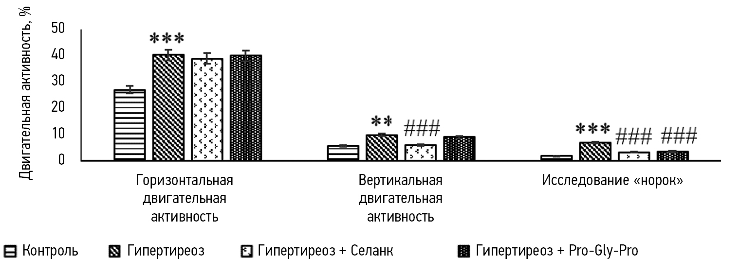 Установлено, что селанк в условиях экспериментального гипертиреоза способствует снижению вертикальной двигательной активности крыс-самцов на 39% и специфической норковой — на 54% по сравнению с группой «гипертиреоз» (p < 0,001). Введение соединения Pro-Gly-Pro крысам с гипертиреозом привело к уменьшению вертикальной двигательной активности на 9% (p > 0,05) и специфической норковой — на 50% (p < 0,001) по отношению к животным с моделью экспериментального гипертиреоза.
