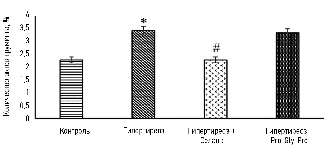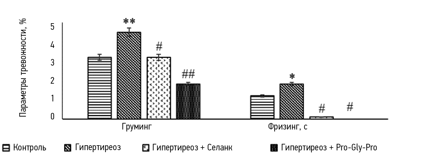 Введение селанка крысам-самцам с моделью экспериментального гипертиреоза способствовало снижению числа груминговых реакций на 29% (p < 0,05) и замираний — на 94% в сравнении с группой животных с гипертиреозом (p < 0,05). Применение Pro-Gly-Pro в условиях экспериментального гипертиреоза сопровождалось также уменьшением количества груминговых реакций на 60% (p < 0,01) относительно группы особей с экспериментальным гипертиреозом. При этом в данной группе животных фризинг не наблюдался. Таким образом, применение препарата «Селанк» и его аналогичного структурного трипептида Pro-Gly-Pro в условиях экспериментального гипертиреоза приводит к восстановлению ориентировочно-исследовательской двигательной активности и показателей тревожности (число актов груминга и времени фризинга) лабораторных животных.