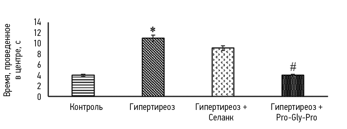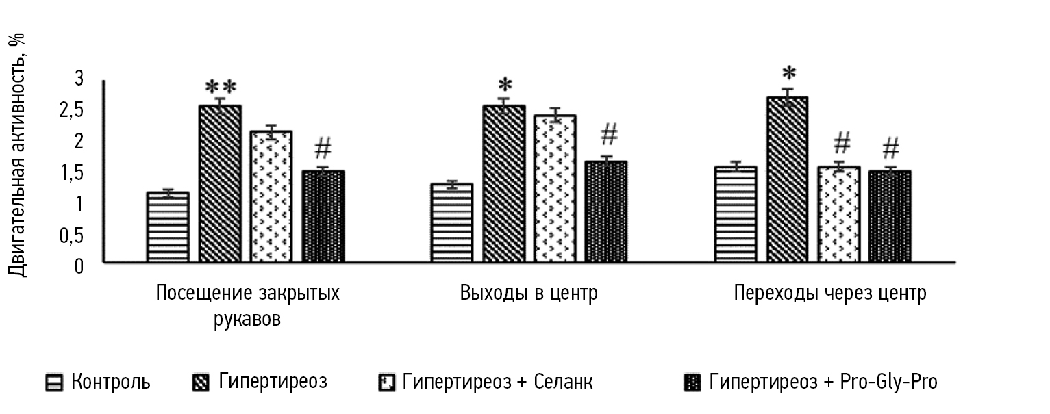 Применение селанка в условиях экспериментального гипертиреоза сопровождалось уменьшением количества заходов в закрытые рукава на 17% (p > 0,05), переходов через центр — на 42% относительно группы особей с гипертиреозом (p < 0,05). Введение Pro-Gly-Pro крысам-самцам с моделью гипертиреоза привело к снижению числа посещений закрытых рукавов лабиринта на 42%, выходов в центр — на 35%, переходов через центр — на 44% (см. рис. 3), а также времени пребывания в центральной зоне теста — на 63% по отношению к группе с гипертиреозом (p < 0,05).