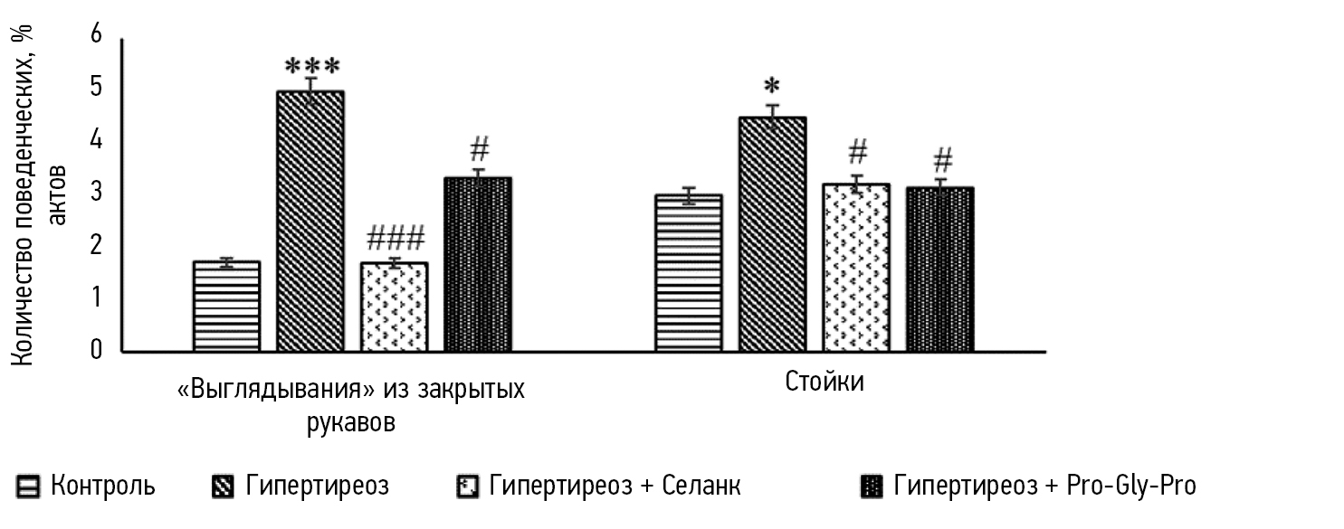 Применение селанка сопровождалось снижением количества «выглядываний» из закрытых рукавов на 66% (p < 0,001), стоек и реакций груминга — на 28 и 33% относительно животных с моделью гипертиреоза (p < 0,05). Введение структурного аналога Pro-Gly-Pro крысам на фоне экспериментального гипертиреоза привело к уменьшению числа «выглядываний» из закрытых рукавов и стоек в среднем на 30% по сравнению с особями с моделью гипертиреоза (p < 0,05).