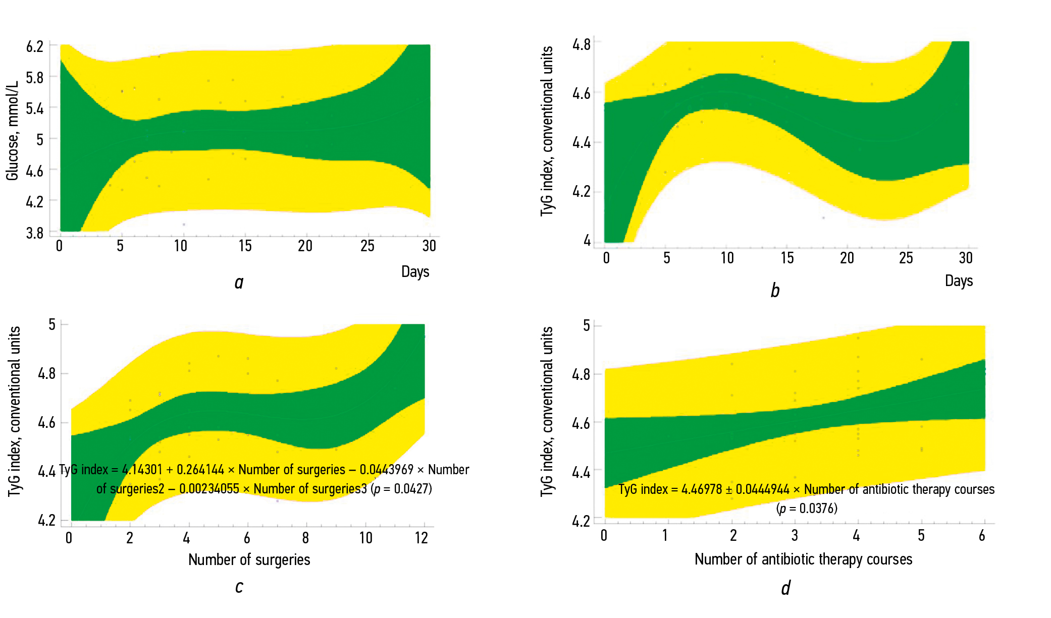 Polynomial regression revealed no significant changes in serum glucose levels (p = 0.555) and TyG index (р = 0.448), depending on the time from combat surgical trauma (Fig. 1, а). However, the TyG index increased up to >4.49 conventional units on days 1–8 after injury, plateaued on day 11, and decreased on day 22 (Fig. 1, b). Moreover, complex associations were observed between the TyG index and number of surgeries. The TyG index increased as the number of surgeries increased to four. An increase in the number of surgeries to eight did not cause an increase in the TyG index (Fig. 1, c); however, it increased later. A direct linear correlation was found between the TyG index and number of antibiotic therapy courses (Fig. 1, d).