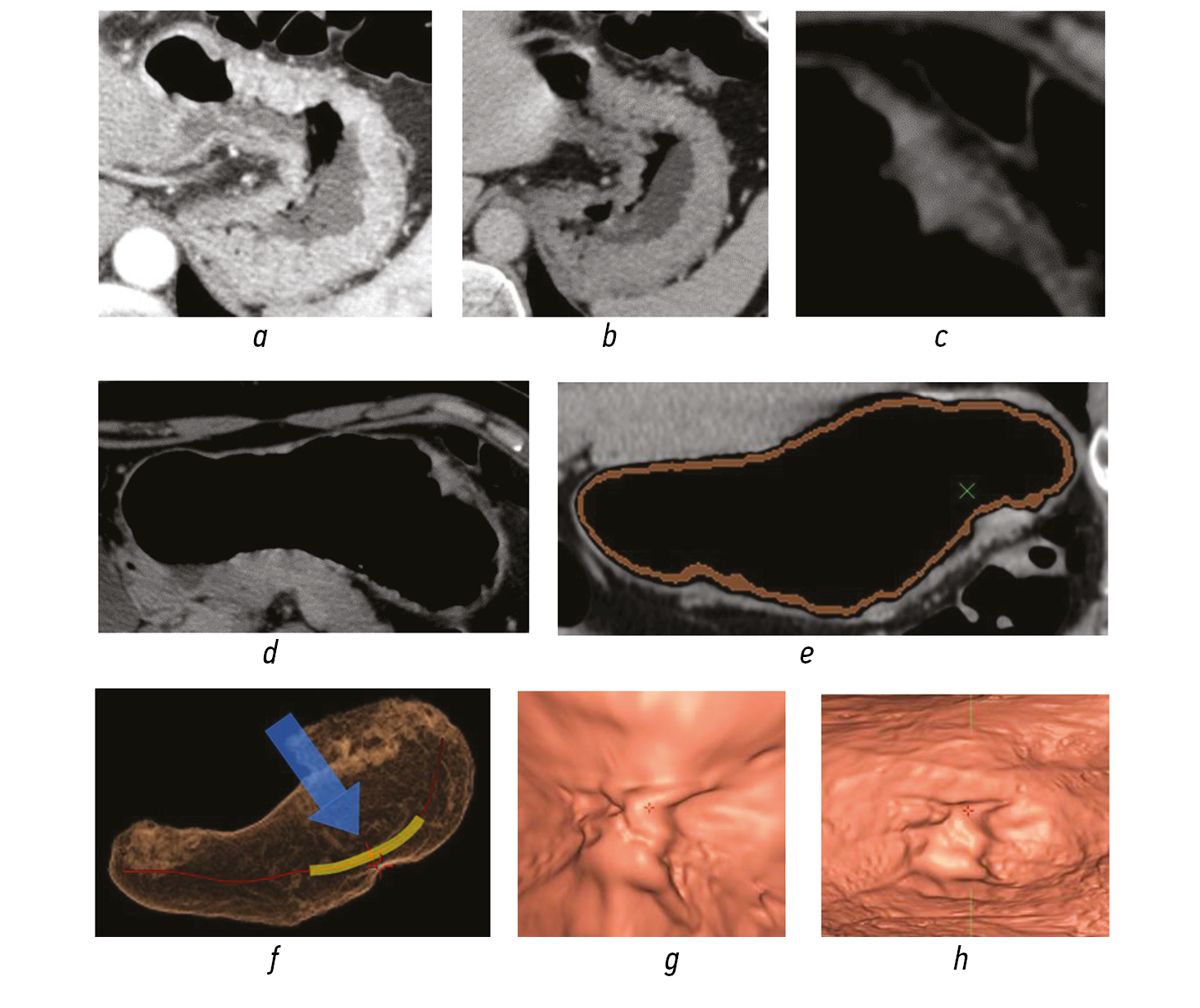 Fig. 1. Gastric cancer category T3. In the arterial and portal scanning phases (a, b), gastric cancer of the T3 category is not visualized by computed tomography according to the standard protocol without targeted preparation of the stomach for examination. Visualization of the same case of gastric cancer during computed tomography and pneumogastrography with three-dimensional reconstruction and virtual gastroscopy (c–h)