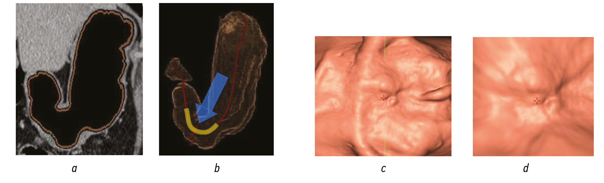 Рис. 2. Визуализация раннего рака желудка категории Т1 методом компьютерной томографии и пневмогастрографии с трехмерной реконструкцией и виртуальной гастроскопией (a–d)