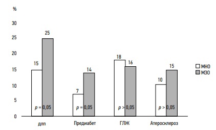 При сравнении частоты нарушений липидного и углеводного обмена у пациентов, страдающих МНО, распространенность ДЛП оказалась в 1,7 раза, а предиабета — в 2 раза ниже, чем у мужчин, страдающих МЗО. При «метаболически нейтральном» типе АО частота атеросклероза общих сонных артерий была в 1,5 раза ниже, чем при МЗО. Гипертрофия левого желудочка (ГЛЖ) в группах встречалась со сравнимой частотой 16–18% (рис.).