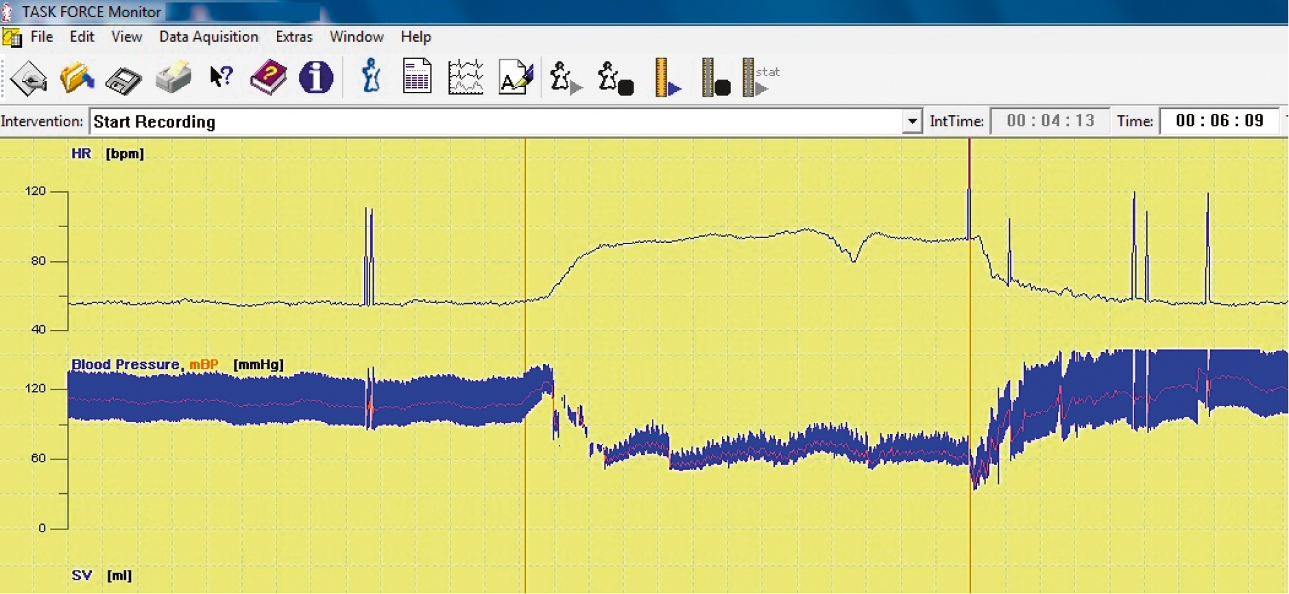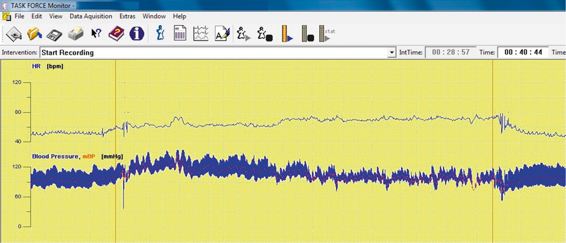 Рис. 1. Фрагмент модифицированной длительной пассивной ортостатической пробы у пациента М., 72 лет, страдающего артериальной гипертензией, с наличием в анамнезе инфаркта миокарда. Кривые частоты сердечных сокращений (верхняя кривая) и артериального давления (нижняя кривая), полученные в режиме непрерывной регистрации, свидетельствуют о близкой к физиологической гемодинамической реакции на ортостаз и достаточной барорефлекторной чувствительности