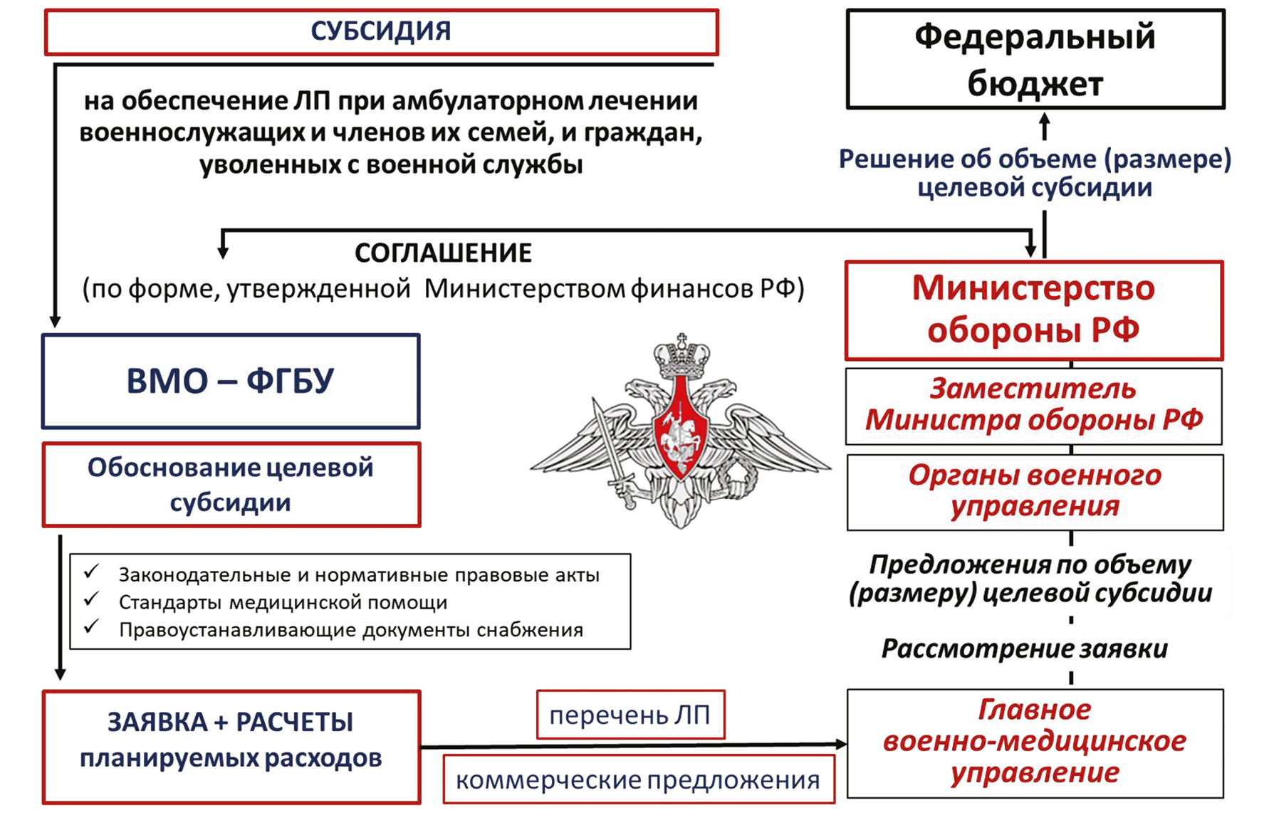 Для выделения целевой субсидии ВМО представляет в орган военного управления заявку, содержащую расчеты планируемых расходов с приложением необходимых материалов (перечень планируемых к закупке ЛП, коммерческие предложения потенциальных поставщиков и др.). Заявка рассматривается в соответствующих органах военного управления, после чего принимается решение о выделении субсидии. Предоставление субсидий осуществляется на основании соглашений, заключаемых между МО РФ и ВМО (рис. 1).