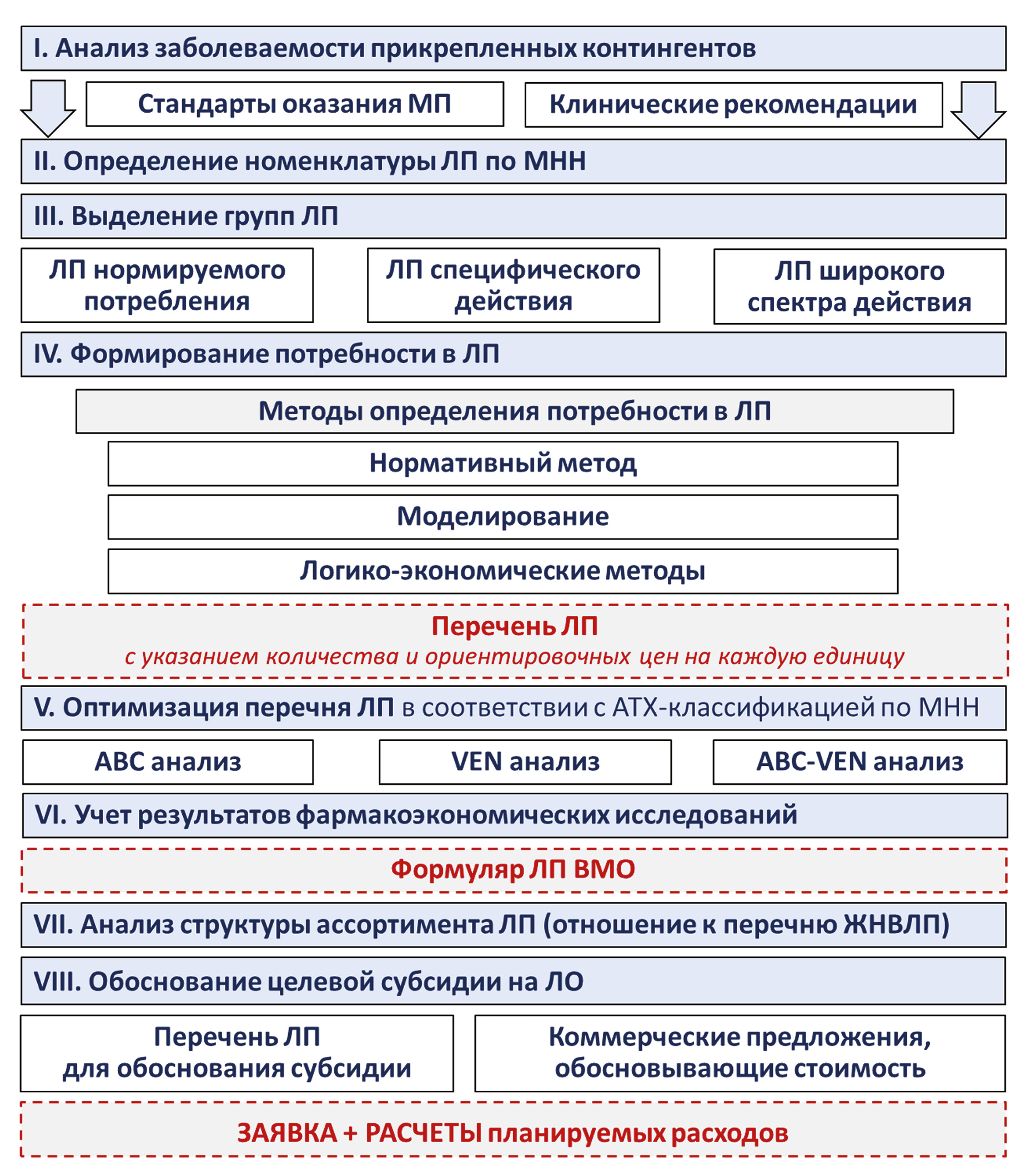 Таким образом, наиболее приемлемым является расчетно-нормативный (стандартный) способ с последующей корректировкой, позволяющий обосновать сформированную потребность в соответствии с действующими ФЗ РФ и НПА ФОИВ. Сформированная потребность, как правило, представляется в виде единого перечня с указанием количества и ориентировочных цен на каждое наименование ЛП. На следующем этапе работы рекомендуется оптимизация сформированного ассортиментного перечня.