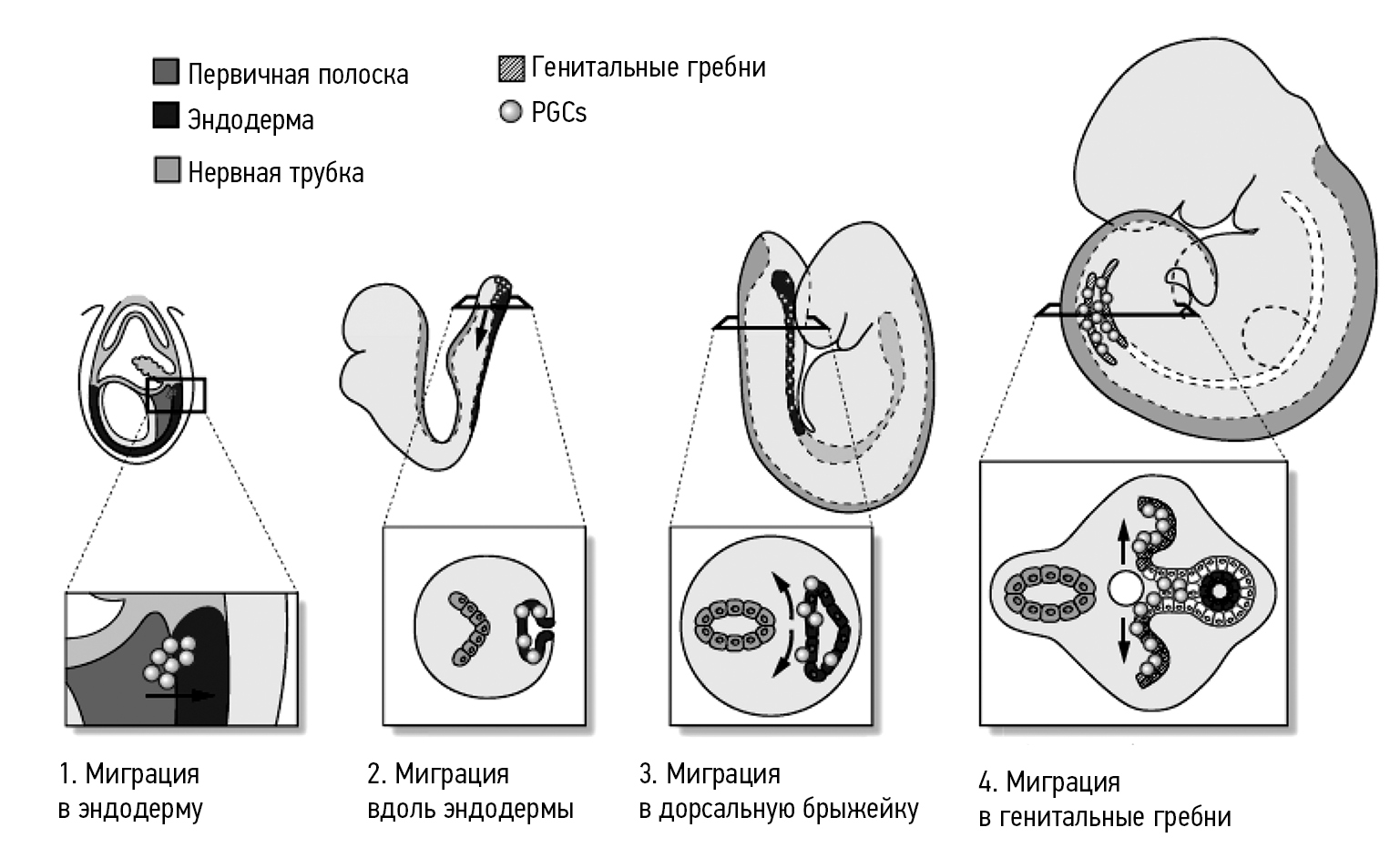 Динамика механизмов формирования зиготы сопровождается повторным снижением клеток с низкой жизнеспособностью, эти процессы также уменьшают число мутаций и других неблагоприятных негенетических изменений. Истинные зародышевые клетки (Primordial Germ Cells — PGCs) образуются у животных на ранних стадиях развития. У беспозвоночных животных оплодотворенная яйцеклетка может быть представлена зародышевой цитоплазмой, в которой впоследствии формируются ЗК. У мышей PGCs образуются в результате индукции костного морфогенетического белка (Bone morphogenetic protein — BMP) из задней части эпибласта. Доказательством этого является то, что эмбрионы, не имеющие гена Bmp4, не образуют ЗК, и, наоборот, обработка соответствующих эпибластов ВМР будет способствовать генерации PGCs. У приматов и, вероятно, у людей PGCs, в отличие от мышей, образуются из амниона. Ранним специфическим маркером образования PGCs у приматов является фактор транскрипции цинкового пальца (zinc finger transcription factor — BLIMP1), который контролирует многие процессы развития ЗК. У мышей PGCs можно визуализировать на E7.5. Они активируют экспрессию ключевых генов транскрипции в системе поддержания плюрипотентности клеток млекопитающих: область Y, определяющая пол (sex determining region — SRY или Sox2), и поддерживают экспрессию транспортера катионов/карнитинов 4 (organic cation/carnitine transporter 4 — Oct4) и Nanog в раннем эмбрионе. Вскоре после экспрессии Sox2, Oct4, Nanog PGCs проходят стадию глобальной демитиляции ДНК, и картина метилирования гистона смещается в сторону плюрипотентных СК (ПСК). Эти характеристики отражают то, что PGCs имеют многие свойства ПСК. PGCs мышей мигрируют из места своего формирования в развивающихся половых железах в эндодерму дорсальной кишки, затем в дорсальную брыжейку и в латеральную мезодерму, образующую гонады. Эта миграция в основном осуществляется в период Е9.5–11.5. Миграционный путь PGCs контролируется эволюционной системой миграции клеток: фактор 1 стромальных клеток (stromal cell derived factor 1 — SDF1) или CXCL12, выделяемые латеральной мезодермой, CXCR4, G-белком, адсорбированном на PGCs. PGCs эмбрионов, не имеющих гена CXCR4 не достигают гонад [6–7]. Будущее ЗК зависит от того, является ли эмбрион мужским или женским. Механизм формирования пола влияет не только на структуру гонад, вторичные половые признаки, но и на PGCs. Миграционные события в эмбрионах человека похожи на мышиные (рис. 1), но протекают более замедленно: PGCs визуализируются с помощью окрашивания щелочной фосфатазой в проксимальной части желточного мешка примерно на четвертой неделе, а миграция в половые железы осуществляется в течение следующих 2 недель. У мышей PGCs включаются в корд яичек примерно на Е12 и митоз приостанавливается через 1–2 дня [8].
