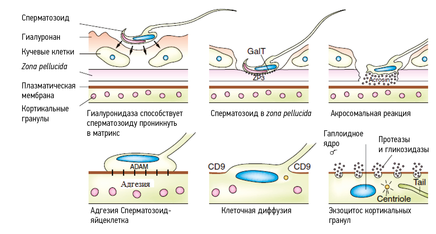 Сперматозоиды нуждаются в активировании, что и происходит в женском репродуктивном тракте в присутствии ионов Са2+ и НСО32–. Этот процесс, называемый капацитацией, сопровождается ростом внутриклеточного рН, увеличением мембранного потенциала от 30 до 50 мВ, а также некоторыми изменениями поверхности клеток, необходимыми для взаимодействия с zona pellucidа яйцеклетки. Гиалуронидаза сперматозоида помогает проникнуть в скопление клеток вокруг яйцеклетки. Как только сперматозоид достигает zona pellucidа развивается последовательность событий необходимых для успешного оплодотворения (рис. 2) [13].