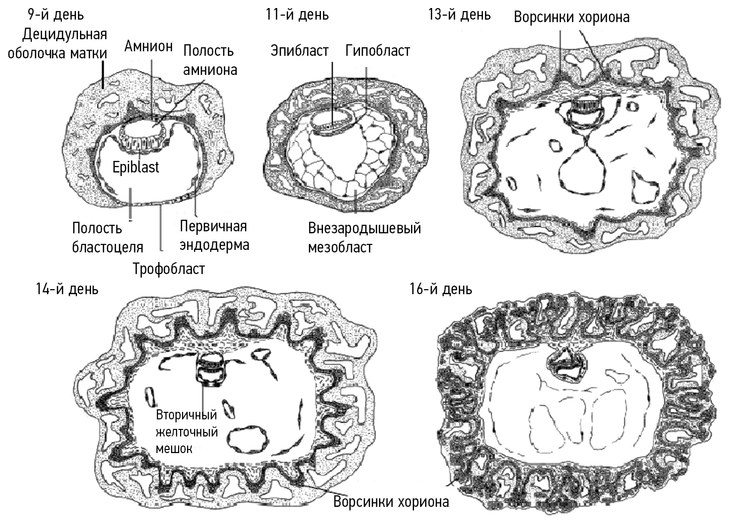 Рис. 4. Развитие яйцеклетки человека. Период формирования амниона, внезародышевой мезодермы, вторичного желточного мешка и ворсинок хориона. Диаметр оплодотворенной яйцеклетки приблизительно равен 0,6 мм в 9 дней, 0,8 мм — в 12 дней, 2,6 мм — в 16 дней (в отличие от мышиного эмбриона эпибласт человека является плоским) / Fig. 4. Early post-implantation development of the human egg. Period of formation of amnion, extra-breathed mesoderm, secondary yolk sac, and chorion lint. The diameter of the fertilized egg is approximately 0.6 mm in 9 days, 0.8 mm in 12 days, and 2.6 mm in 16 days (unlike the mouse embryo, the human epiblast is flat)