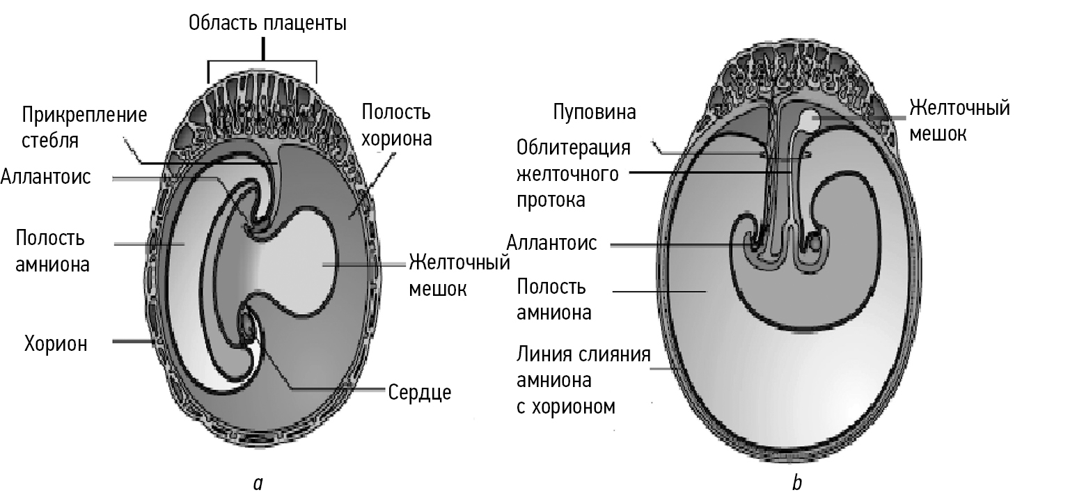 Рис. 5. Формирование внезародышевых органов и зародышевых листков в оплодотворенной яйцеклетке человека: а — приблизительно 3 недели от оплодотворения; b — приблизительно 4 недели от оплодотворения / Fig. 5. Formation of non-breath membranes in a fruitful human egg: а — approximately3 weeks of fertilization; b — approximately 4 weeks from fertilization