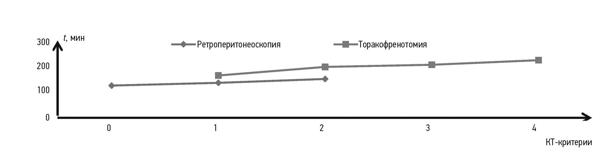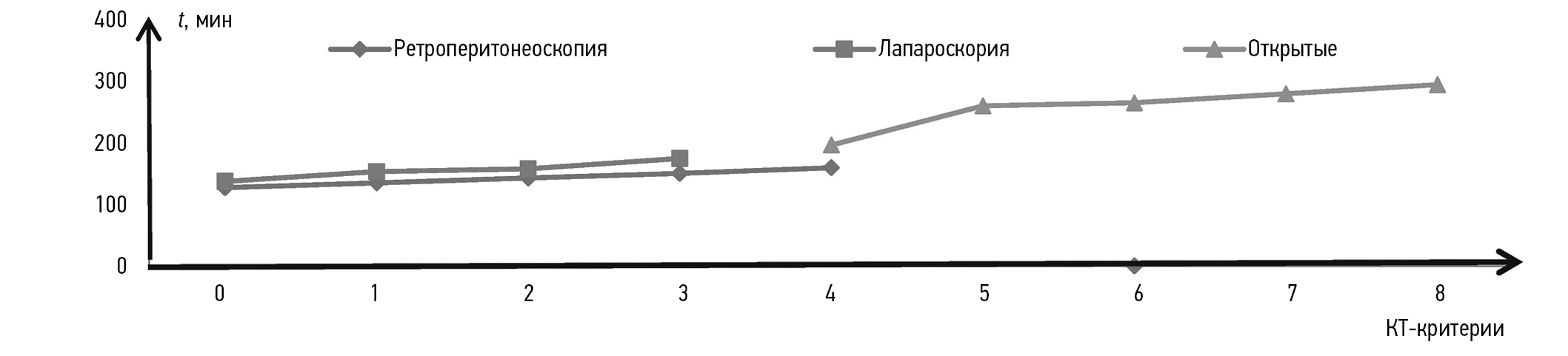 Установлено, что имеется прямо пропорциональная зависимость между количеством критериев риска технических трудностей во время операции и продолжительностью оперативного времени. Кроме того, в случае правосторонней локализации опухоли НП предпочтение отдавали открытым вариантам доступов при наличии четырех и более критериев, в случае левосторонней локализации — при наличии трех и более признаков (р ≤ 0,001).