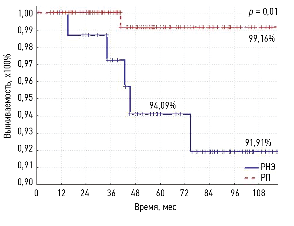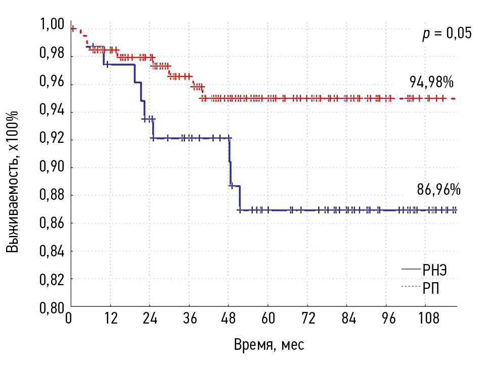 От прогрессии основного заболевания скончались 4 пациента: в 1-й группе 1 (0,5%) и 3 (3,8%) во 2-й. 5- и 10-летняя раково-специфическая выживаемость после РП составила 99,16 ± 0,84%, а после РНЭ — 94,09 ± 2,87 и 91,91 ± 3,54% (p = 0,05) (рис. 3).