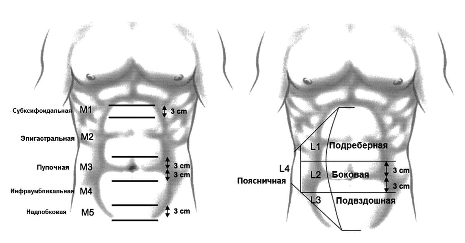 Срединная | Субксифоидальная М1 Эпигастральная М2 Пупочная М3 Инфраумбиликальная М4 Надлобковая М5 | |||