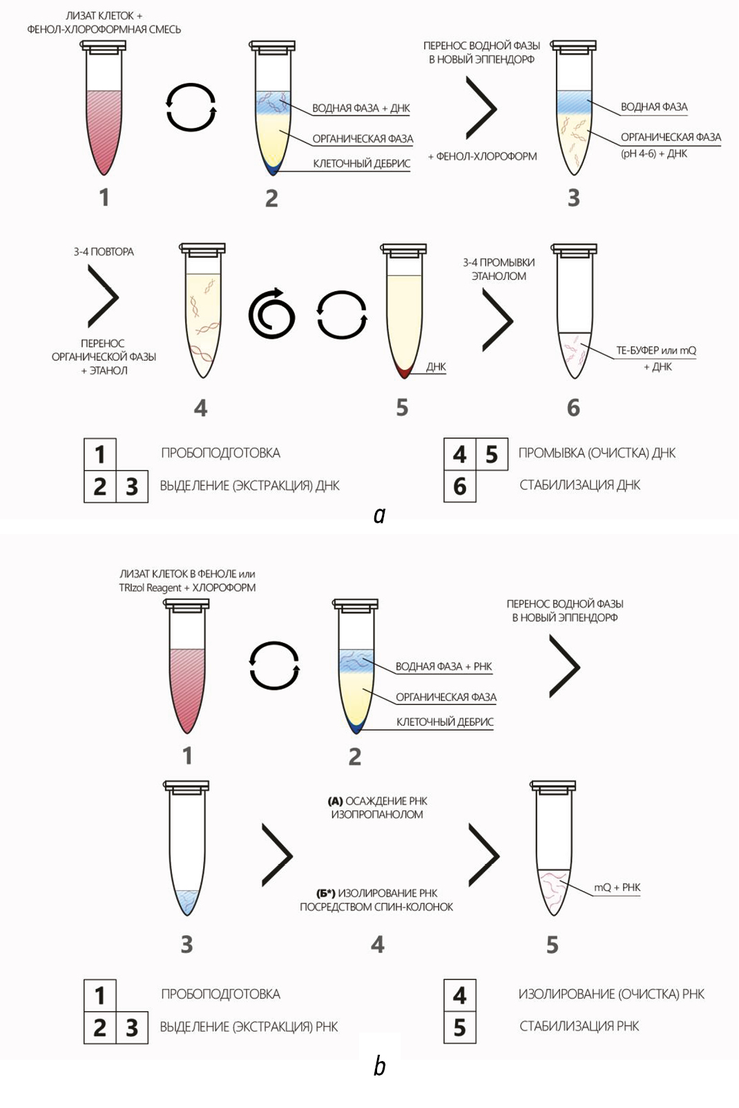 Рис. 1. Органическая (фенол-хлороформная) экстракция нуклеиновых кислот: а — геномной ДНК; b — РНК