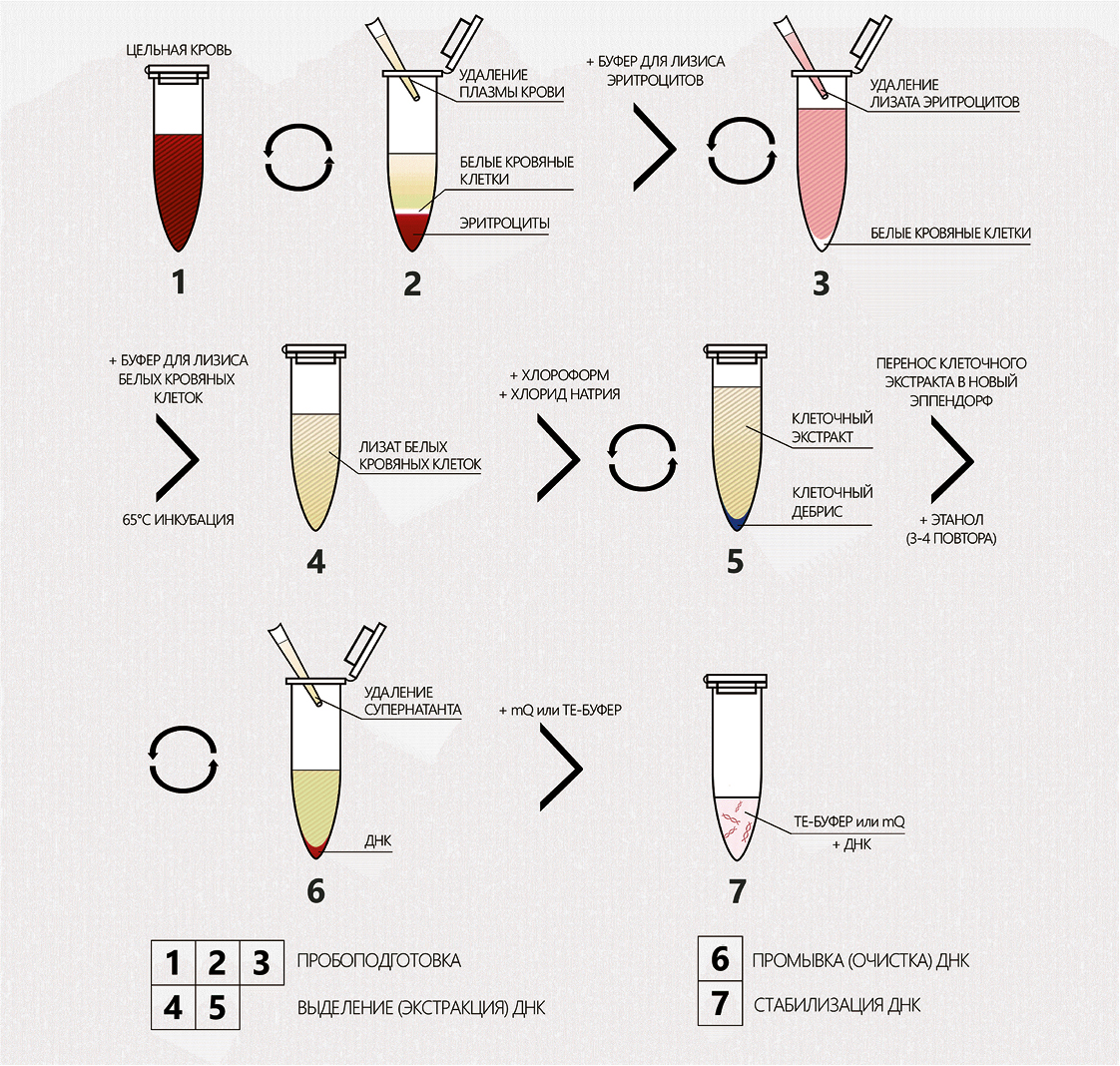 Современные методики выделения и очистки геномной ДНК из клеток крови состоят из трех последовательных стадий: 1) лизис безъядерных клеток (эритроцитов), центрифугирование и удаление супернатанта, содержащего клеточный дебрис; 2) лизис ядерных клеток (лейкоцитов), осаждение белков и высвобождение ДНК насыщенным раствором NaCl в водную фазу, которую переносят в новую пробирку; и 3) осаждение ДНК из водной фазы этанолом или изопропанолом, очистка от примесей и растворение полученной ДНК в TE-буфере или mQ [23]. Альтернативный протокол содержит незначительные отличия, такие как предварительная промывка цельной крови от плазмы, термический лизис лейкоцитов и осаждение белков не только насыщенным раствором NaCl, но и хлороформом [24].