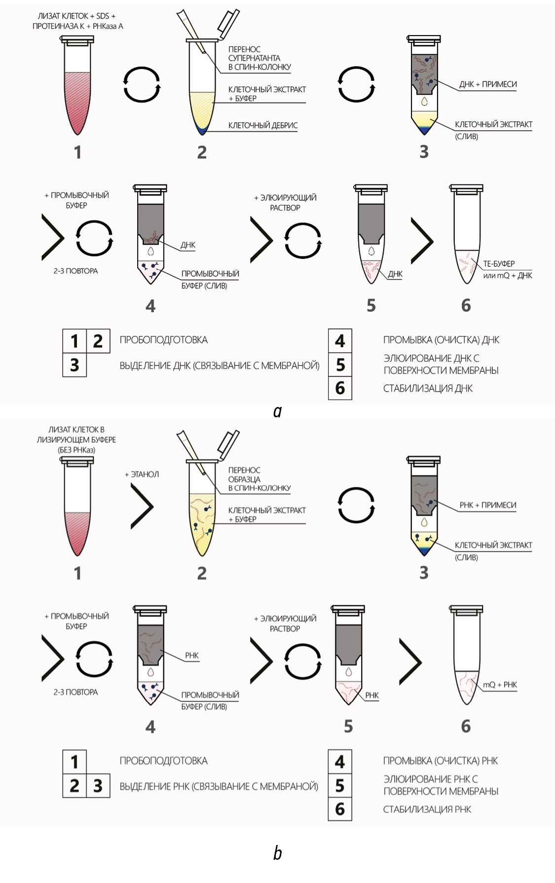 Рис. 3. Выделение нуклеиновых кислот с использованием спин-колонок: a — геномной ДНК; b — РНК