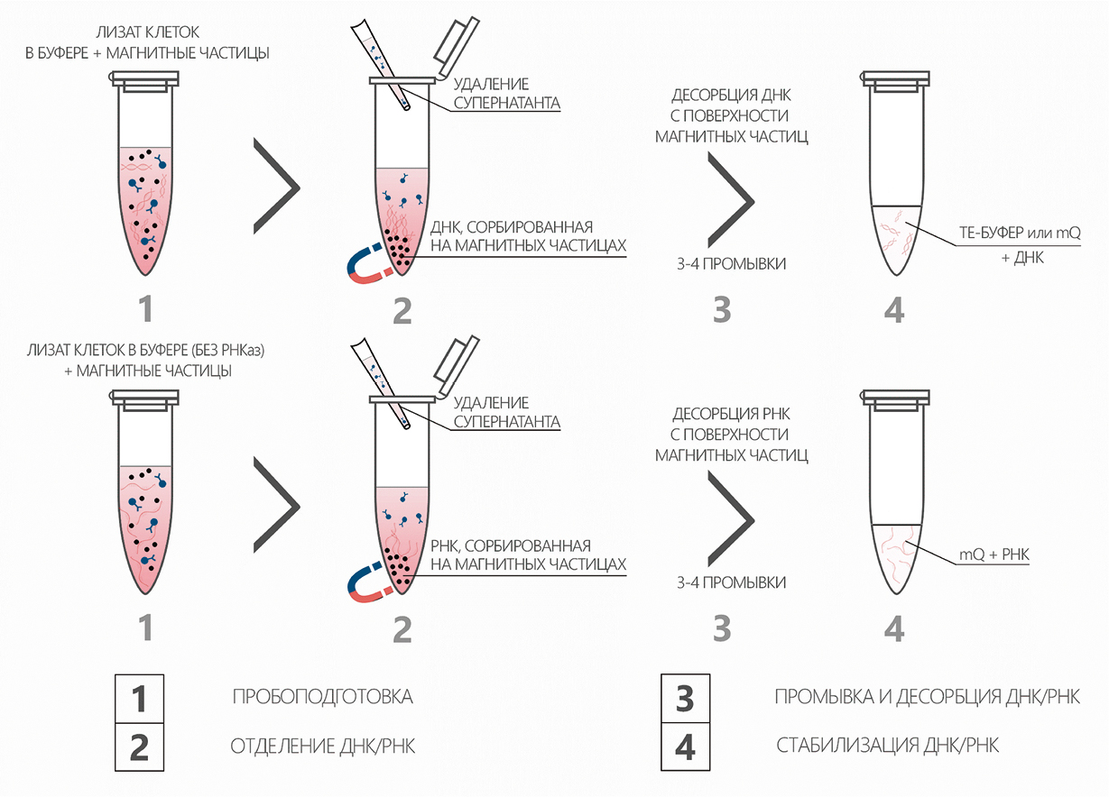 Клетки лизируют в буфере и вносят в пробирку магнитные частицы, сорбирующие нуклеиновые кислоты из клеточного экстракта. Пробирку ставят на магнитный штатив, который притягивает магнитные частицы к стенке. Удаление супернатанта и промывка позволяют быстро очистить притянутые магнитные частицы от несвязанных примесей, в том числе от нуклеиновых кислот, не содержащих целевую последовательность (рис. 4) [29, 30].