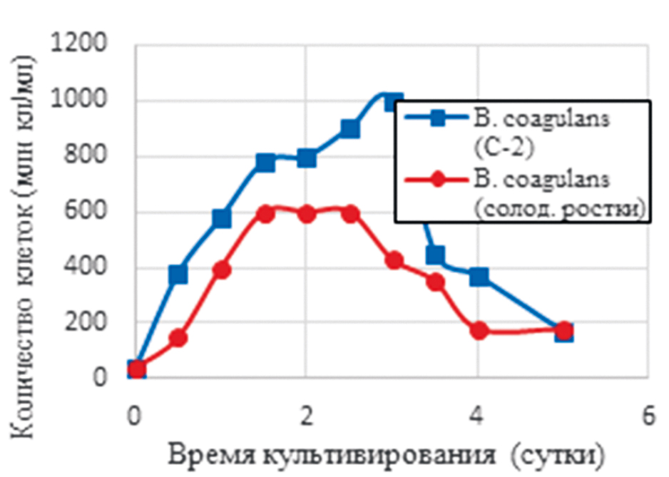 Анализ результатов исследования (рис. 1) позволил сделать вывод, что наибольшая концентрация молочнокислых бактерий (100 млн кл/мл) была достигнута на 3-и сутки культивирования на питательной среде, в которой в качестве стимулирующих веществ использовалась культуральная жидкость микроводорослей C. vulgaris (очищенный модельный раствор сточных вод). Концентрация клеток в среднем в 1,7 раза выше, чем в контрольном образце, в котором в качестве источника стимулирующих веществ использовался экстракт солодовых ростков. После 3-их суток культивирования рост клеток молочнокислых бактерий замедлялся, так как к этому времени в культуральной жидкости наблюдалось значительное содержание молочной кислоты 30–50 г/л, ингибирующей рост клеток.