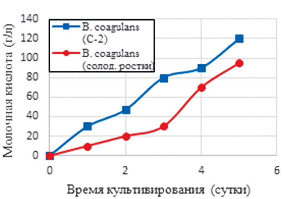 В настоящее время для промышленного производства молочной кислоты используются штаммы молочнокислых бактерий, способные синтезировать молочную кислоту L-формы, усваивая в процессе жизнедеятельности сбраживаемые сахара [4]. Выход молочной кислоты из сбраживаемого сахара может достигать 95%. Этот вид бактерий является факультативным анаэробом, не способен к синтезу индольных веществ, растет на культуральных средах, содержащих моно-, ди- и полисахариды.