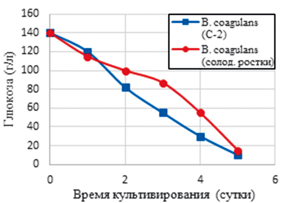 Данный факт объясняется тем, что глюкоза необходима как для размножения клеток и поддержания их нормальной жизнедеятельности, так и для синтеза молочной кислоты. Максимальное усвоение глюкозы наблюдалось при культивировании вида B. сoagulans на модельном растворе сточных вод, очищенных микроводорослями, и составляло 93% (табл. 2).