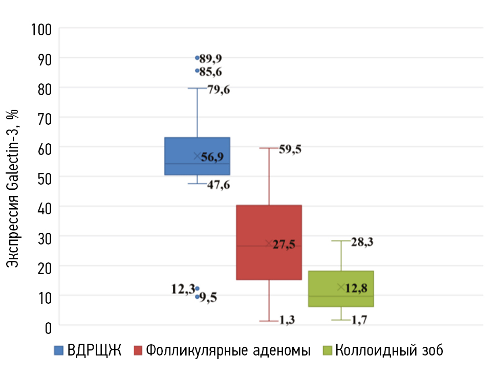 Выявлено, что среди больных с цитологически подтвержденным РЩЖ (n = 35) и подозрением на него (n = 6) низкие значения экспрессии Galectin-3 в 3 случаях указывали на доброкачественный характер заболевания. Среди 42 пациентов, страдающих фолликулярными неоплазиями, у 32 (76,2%) значения его экспрессии были снижены и колебались от 1,3 до 45,8%, а гистологически отмечались признаки доброкачественных изменений. Лишь у 5 (11,9%) больных, страдающих фолликулярными аденомами, значения экспрессии Galectin-3 были выше его порогового уровня в 47,6%. У 5 пациентов с высокой экспрессией данного маркера (53,3; 54,3; 58,3; 66,4 и 89,9%) был диагностирован ВДРЩЖ.