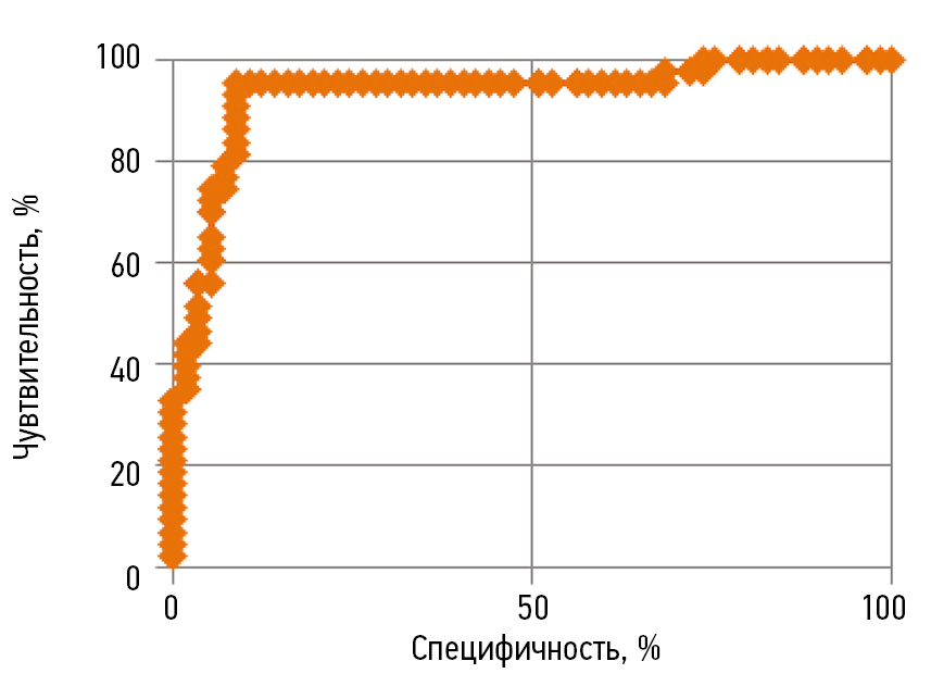 Статистическую обработку полученных данных проводили на персональном компьютере с помощью пакета прикладных программ Statistica for Windows 7 и Microsoft Excel (Microsoft Office 2013, США). Осуществляли определение традиционных показателей описательной статистики, достоверность различий переменных в выборках по t-критериям Стьюдента и Фишера (достоверным считали различие при р < 0,05 и f < 0,05), применяли коэффициент ранговой корреляции Спирмена и диагностическую значимость отдельной методики, так называемый ROC-анализ (Receiver Operator Characteristic) с определением порога или точки отсечения (cut-off value) и площади под кривой (Area Under Curve — AUC). Информативность методик исследования оценивали по чувствительности, специфичности, точности, положительной и отрицательной прогностической ценности.