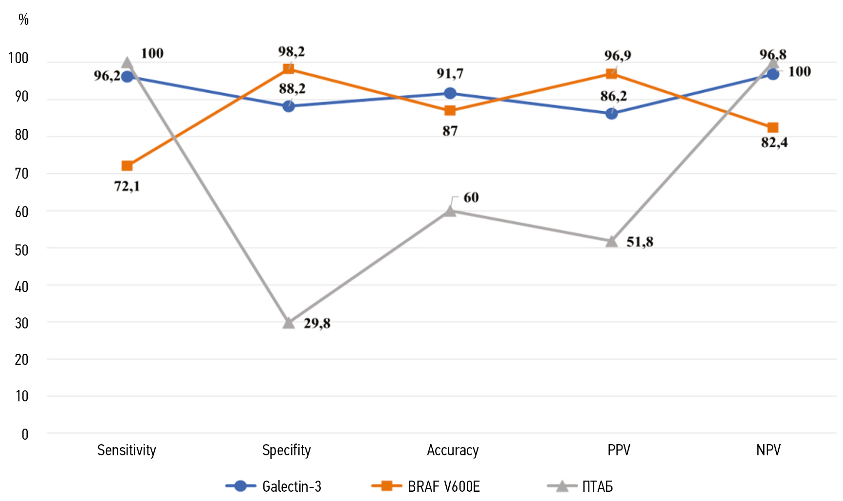 Чувствительность, специфичность, точность, положительная и отрицательная прогностическая ценность выявления мутации V600E гена ВRАF путем ПЦР составили 72,1, 98,2, 87, 98,2 и 82,4% соответственно.