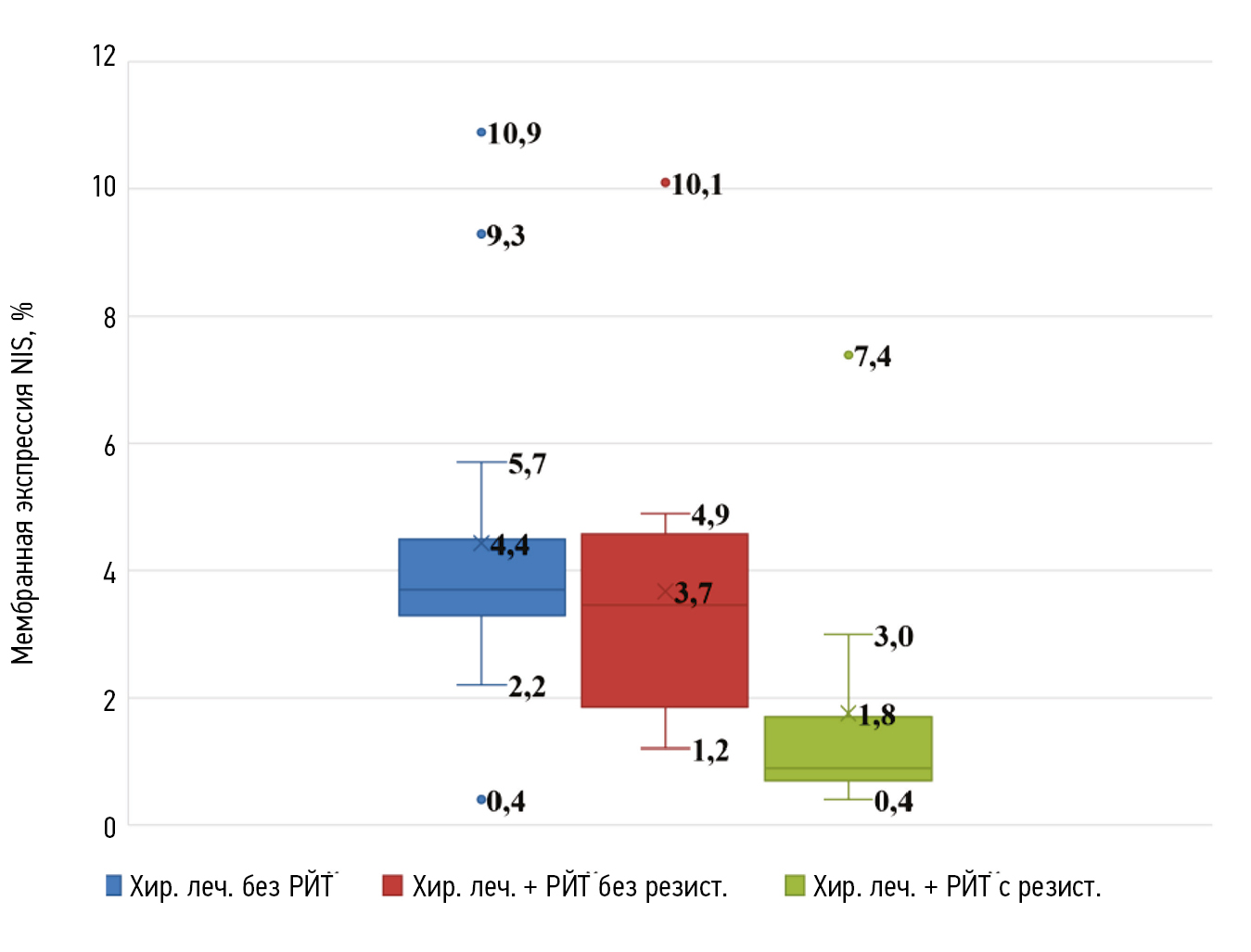 Рис. 4. Результаты исследования мембранной экспрессии NIS по подгруппам эффективности РЙТ