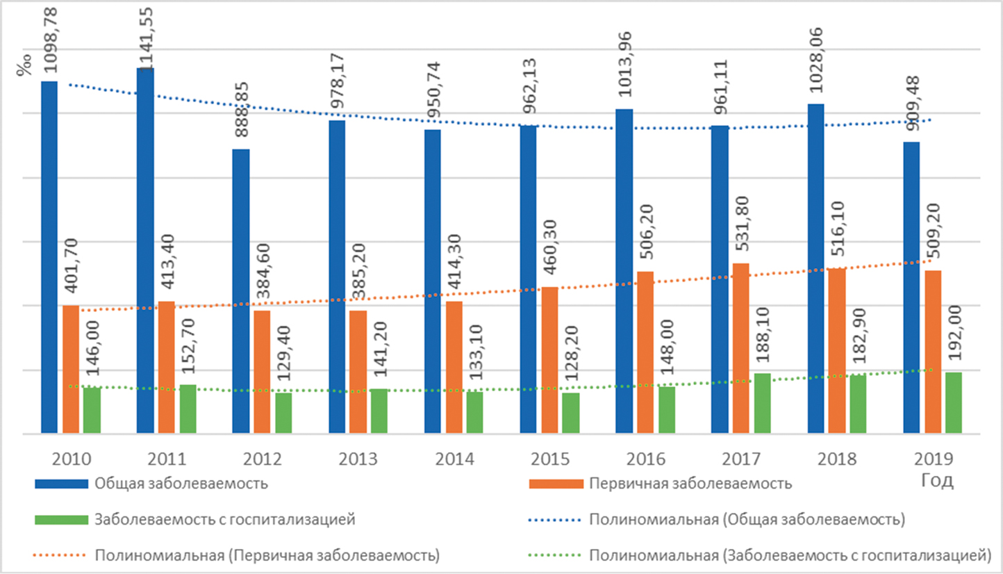 Многолетняя динамика медико-статистических показателей состояния здоровья анализировалась путем расчета среднего абсолютного прироста (САП), темпа прироста за период, построения графика, его аналитического выравнивания с помощью расчета полиноминального тренда 2-й степени с расчетом коэффициента детерминации (R²) для оценки точности модели [16]. Количественные данные представлены в виде средних арифметических и их 95% доверительных интервалов (95% ДИ) [17].