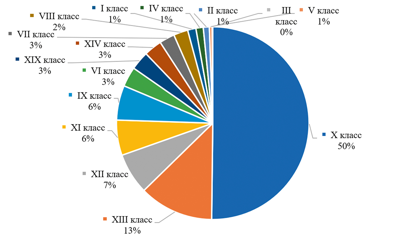 Среди остальных классов болезней наибольшую долю (13%) составили заболевания опорно-двигательной системы. Болезни кожи и подкожной клетчатки (XII класс), болезни органов пищеварения (XI класс) и болезни системы кровообращения заняли в нозологической структуре 7, 6 и 6% соответственно. Остальные классы болезней были представлены значениями ниже 4%.