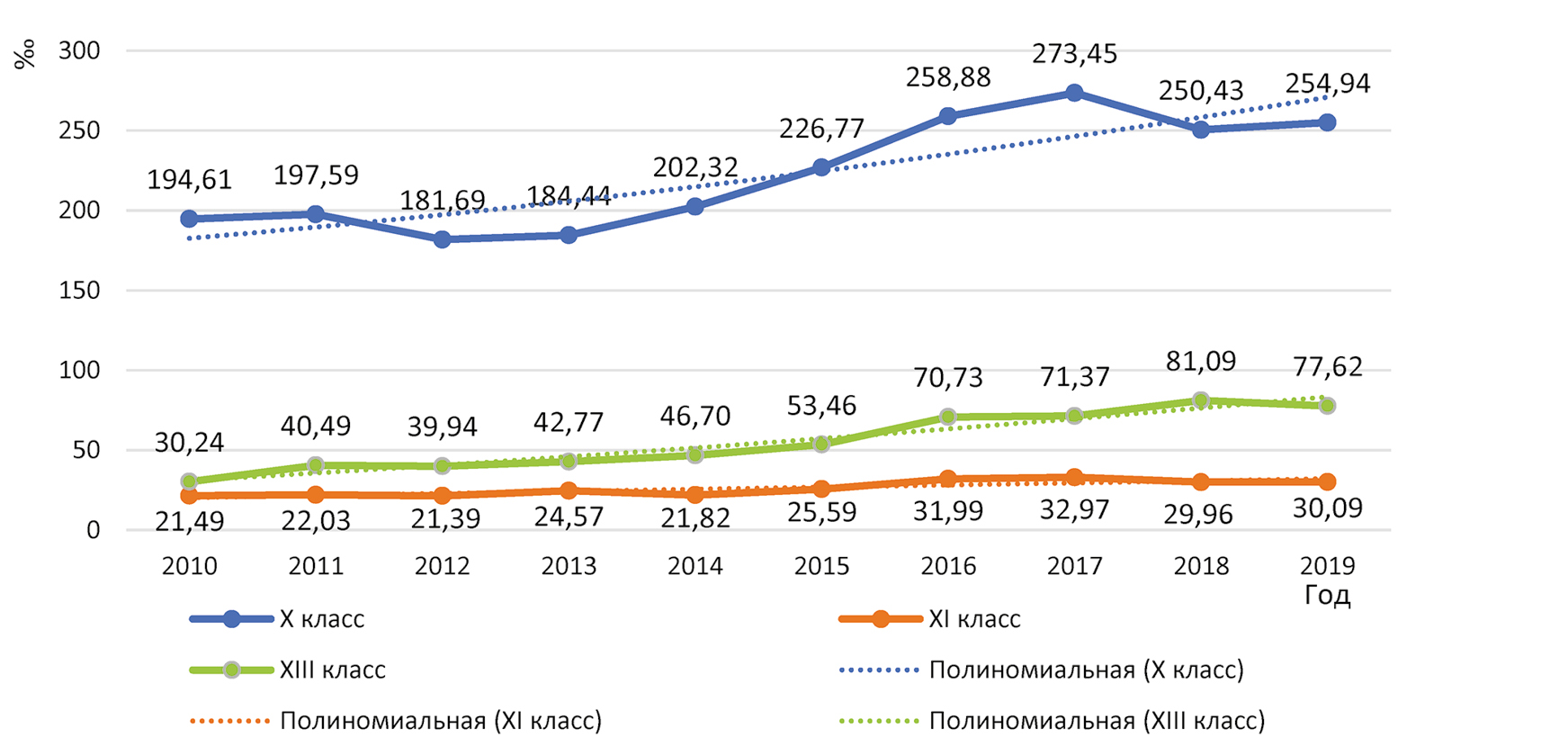 Класс заболеваний | Первичная заболеваемость, ‰ | Темп прироста, % | Уравнение полиномиального тренда 2-й степени (коэффициент детерминации R²) | |