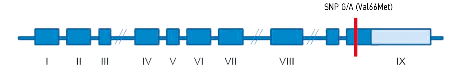 Ген BDNF человека локализован в регионе р14 11-й хромосомы, содержит 12 экзонов, 9 из которых имеют специфические промоторы (I–VIII 5`-экзоны, сплайсирующиеся (соединяющиеся) с общим 3`-экзоном IX; рис. 1).