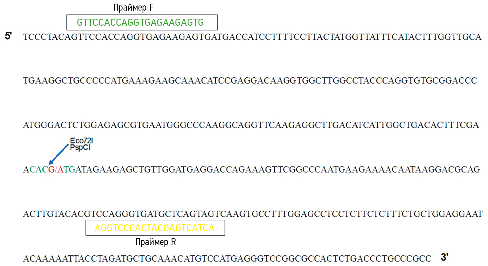 Для дизайна праймеров, фланкирующих (ограничивающих) регион rs6265, использовали последовательность гена BDNF длинной 433 пар нуклеотидов (п. н.). Выбор прямого и обратного праймеров производили, используя комбинацию данных из литературных источников [27, 28] и специализированных веб-приложений. В результате для амплификации интересующего нас фрагмента гена BDNF был выбран прямой праймер F (5’- GTTCCACCAGGTGAGAAGAGTG-3’) и обратный праймер R (5’- ACTACTGAGCATCACCCTGGA-3’), рис. 2. Расчетная температура плавления олигонуклеотидов составляла 65,5 и 65,7 оC соответственно. Праймеры не образуют стабильных вторичных структур. Присутствует 3› GC clamp. Длина амплифицируемого фрагмента 316 п. н.