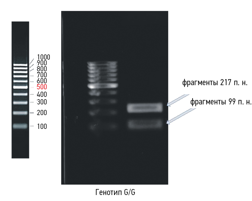 Рис. 4. Результат определения генотипа G/G путем разделения фрагментов рестрикции в 1,5% агарозном геле