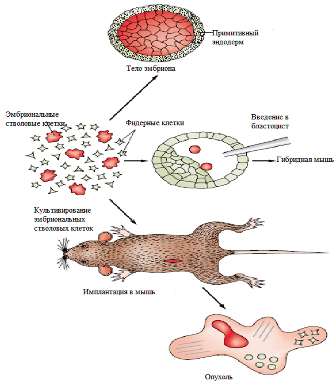 Третий тип дифференциации осуществляется, если ЭСК мыши вводятся повторно в полость бластоцисты ранней оплодотворенной яйцеклетки или агрегированием с ранними бластомерами (см. рис. 1). ЭСК мыши контактируют с ВМК и способствуют формированию и развитию всех структур и тканей эмбриона. В таких экспериментах донорские клетки генетически отличаются от клеток реципиента. Поэтому полученный эмбрион, состоящий из двух генетически различных популяций клеток, будет гибридным (химерным). Если эмбрионы реимплантируются в матку реципиентной самки мыши, то они развиваются в более ранние сроки, что позволяет выращивать и спаривать гибридных мышей. Таким образом можно получать потомство с генетическими маркерами оригинальной линии ЭСК. Это подтверждает происхождение функциональных зародышевых клеток из ЭСК, введенных в эмбрион, и гибридизация зародышевой линии, что используется для незначительно дефектных линий ЭСК при генерации химер. Таким образом, формирование зародышевой гибридной линии является «золотым стандартом» плюрипотентного поведения клеток [14].