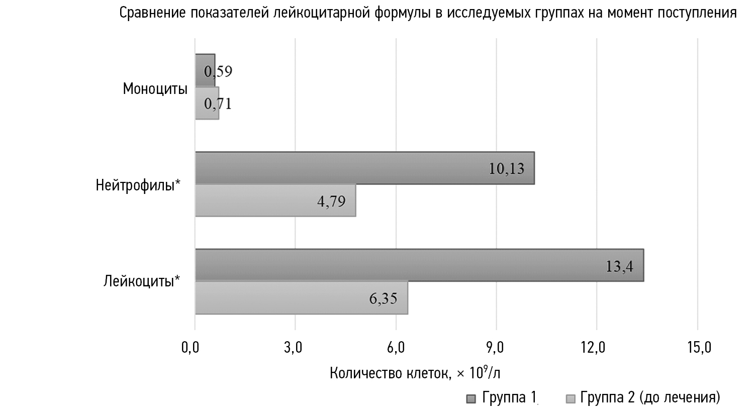 У пациентов с признаками присоединения бактериальной инфекции уровни лейкоцитов и нейтрофилов значимо (р <0,001) превышали референтные значения и показатели больных 2-й группы. Исходный показатель количества моноцитов в обеих группах не различался (рис. 1).