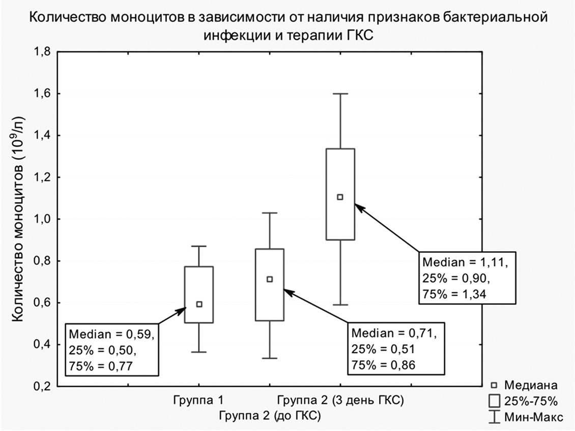 Сравнительная оценка показателей лейкоцитарной формулы между группами на 4-й день госпитализации не проводилась. Это связано с тем, что большей части пациентам 1-й группы также были назначены ГКС совместно с антибактериальной терапией, что оказывало непосредственное влияние на изменение параметров лейкоцитарной формулы. Следовательно, повышение абсолютного числа моноцитов в периферической крови при использовании ГКС может являться не только отличительным признаком стероид-индуцированного лейкоцитоза от ассоциированного c бактериальной ко-инфекцией, но и служить косвенным признаком эффективности терапии данными препаратами.