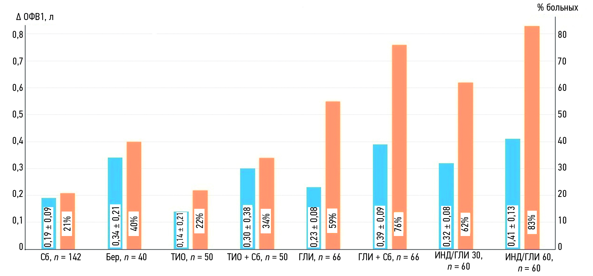 У пациентов 1-й группы на 60-й мин приема первой дозы ГЛИ (ДДАХ с быстрым началом действия) выявлено увеличение значений ОФВ1: фон — 1,36 ± 0,51 л, через 60 мин — 1,58 ± 0,73 л. Прирост ОФВ1 составил 0,23 ± 0,08 л, что не достигало степени статистической значимости и существенно не различалось от результата сБДТ. Однако было отмечено значимое увеличение количества пациентов («ответчиков») с ОБО с 21 до 59% (рис. 1). К 90-й мин на фоне максимизации БДТ с помощью дополнительной ингаляции 400 мкг Сб отмечено статистически значимое увеличение ОФВ1 до 1,75 ± 0,72 л и прироста до 0,35 ± 0,09 л (р < 0,01), что было сопоставимо с приростом ОФВ1 после комбинированных препаратов — Бер и ИНД/ГЛИ через 30 мин. Количество «ответчиков» при этом увеличилось с 59 до 76%.