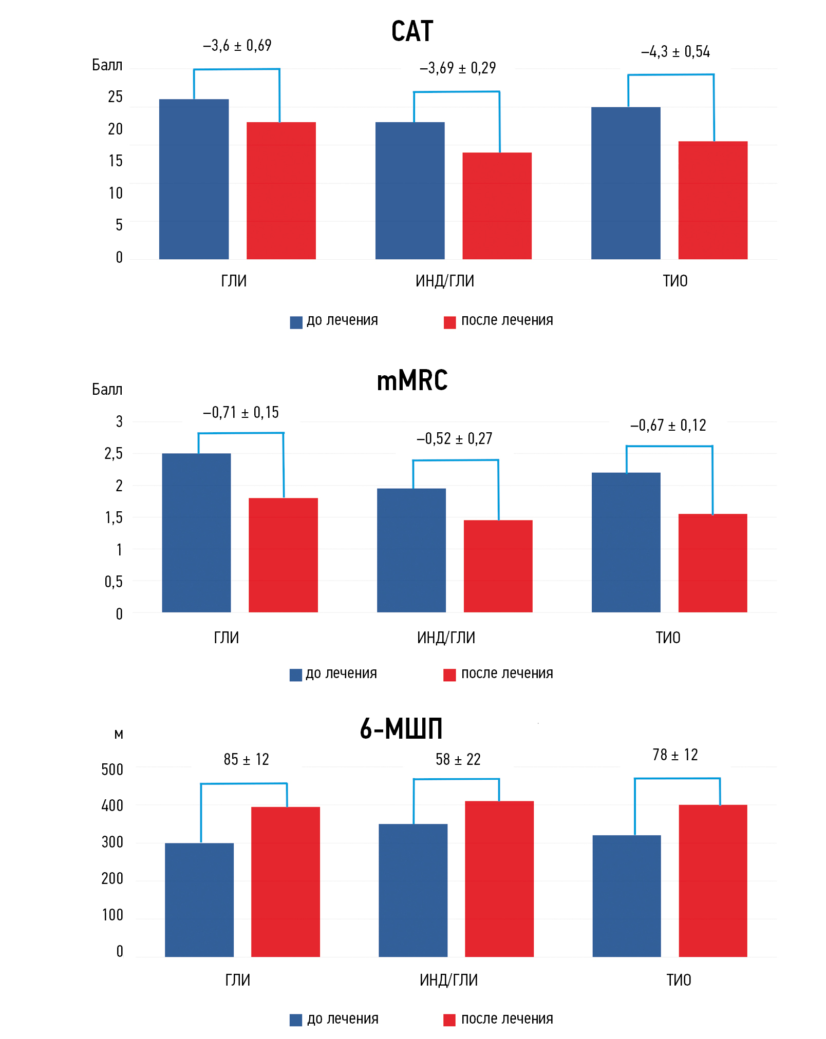Важно подчеркнуть, что отмеченная динамика функциональных показателей на фоне проводимой терапии ГЛИ, ИНД/ГЛИ и ТИО во всех группах сопровождалась положительной динамикой клинических показателей: снижением выраженности одышки по шкале mMRC и значений САТ, повышением толерантности к физическим нагрузкам (рис. 2), что свидетельствовало об улучшении качества жизни обследованных пациентов.