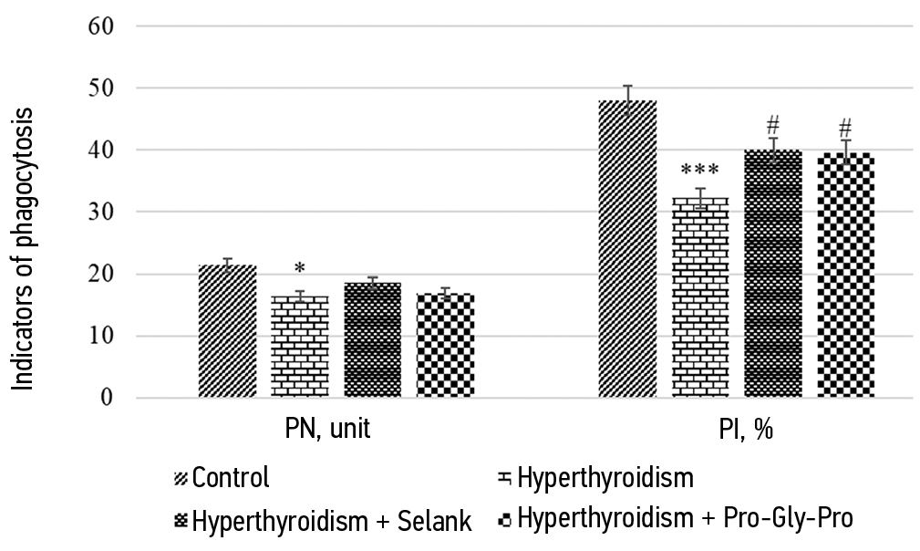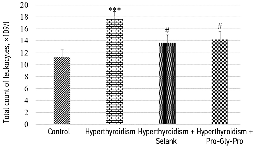The study aimed to analyze the effect of glyproline neuropeptide compounds Selank (Thr-Lys-Pro-Arg-Pro-Gly-Pro) and Pro-Gly-Pro on the leukocyte count and phagocytic activity of neutrophils under experimental hyperthyroidism.