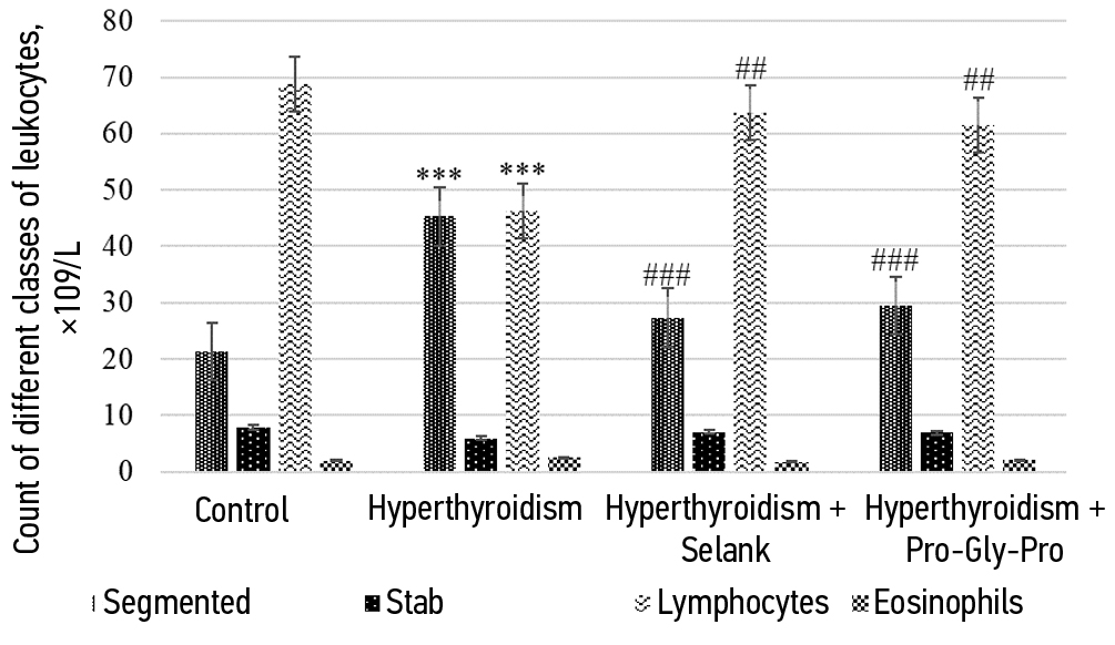 In the experimental hyperthyroidism group, the count of segmented neutrophils increased by 2.1 times (p < 0.001) and that of stab neutrophils increased by 24% (p < 0.05), and the lymphocyte count decreased by 33% (p < 0.01) compared with the control group. Selank contributed to the restoration of quantitative indicators of segmented and stab neutrophils, reducing them by 40% (p < 0.001) and 18% (p < 0.05), respectively, and an increase in the lymphocyte count by 38% (p < 0.01) compared with the hyperthyroidism group. The Pro-Gly-Pro compound led to a decrease in segmented neutrophils by 35% (p < 0.001), stab neutrophils by 15% (p < 0.05), and lymphocyte count by 33% (p < 0.01) in relation to rats with hyperthyroidism (Fig. 2).
