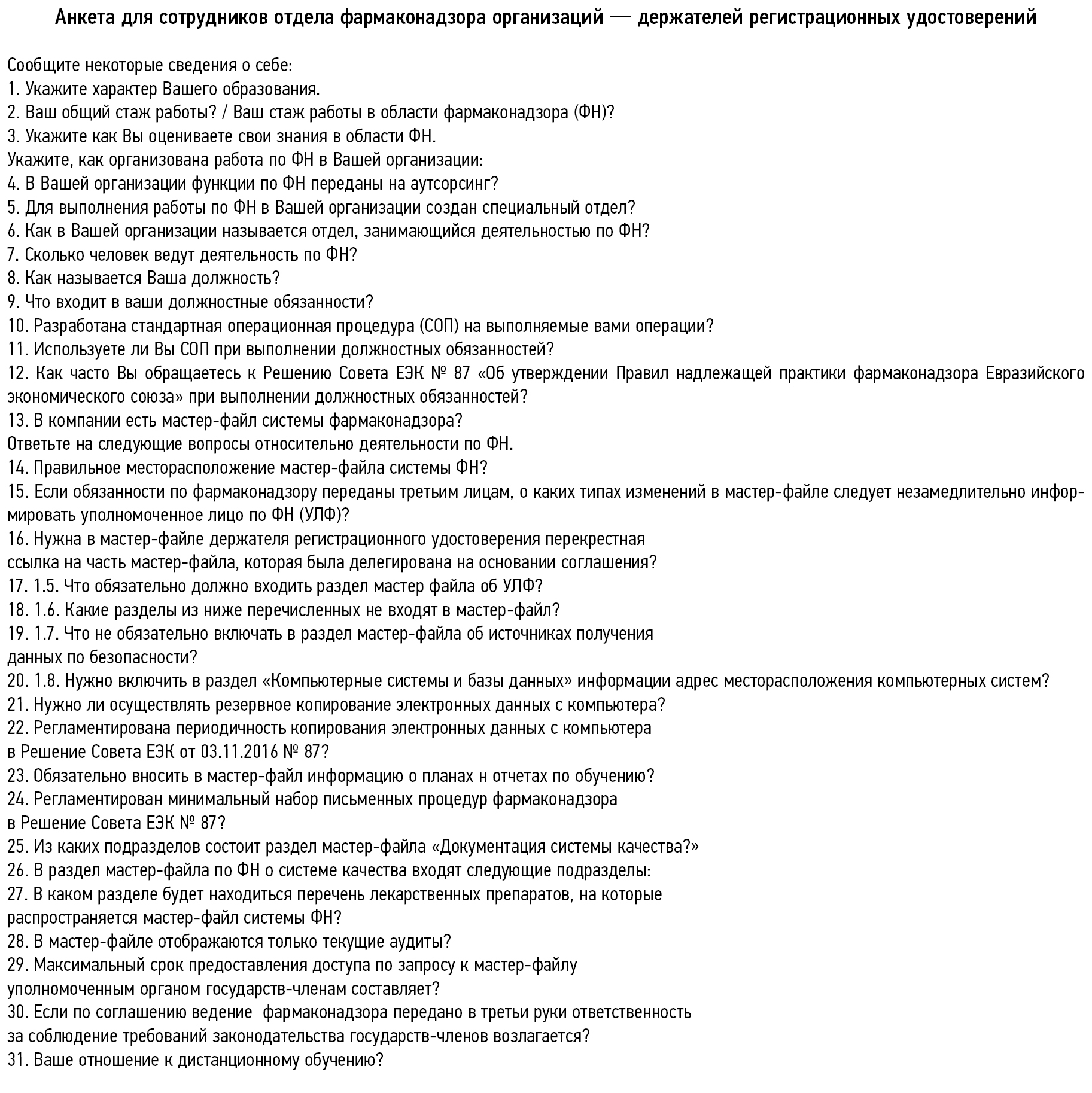 Рис. 1. Анкета для сотрудников отдела фармаконадзора организаций-держателей регистрационных удостоверений
