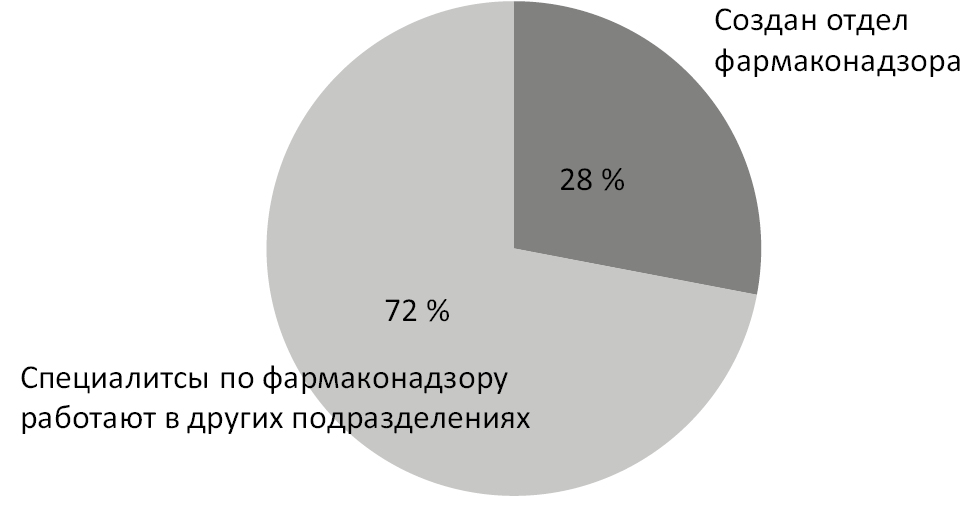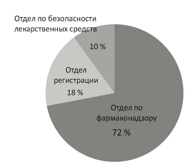 Такой результат может объясняться тем, что специалисты по фармаконадзору часто являются сотрудниками медицинских отделов или отделов по регистрации лекарственных средств, а также тем, что в России производителями лекарственных препаратов и ДРУ являются компании с малым количеством регистрационных удостоверений или часть деятельности передана по договорам аутсорсинга внешним организациям. Выяснилось, что у 6 (10%) человек, в организациях, где не сформирован самостоятельный отдел фармаконадзора, часть деятельности передана на аутсорсинг. А деятельность по фармаконадзору у 11 (18%) человек ведется в отделе регистрации и у 6 (10%) человек — в отделе безопасности лекарственных средств (рис. 4).