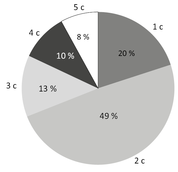 Также было выявлено, что в основном деятельность по фармаконадзору на предприятии осуществляют 2, реже — 3–5 специалистов (29 (49%) опрошенных). Численность персонала по фармаконадзору от 2 до 5 является стандартным набором для небольших локальных ДРУ (рис. 5).