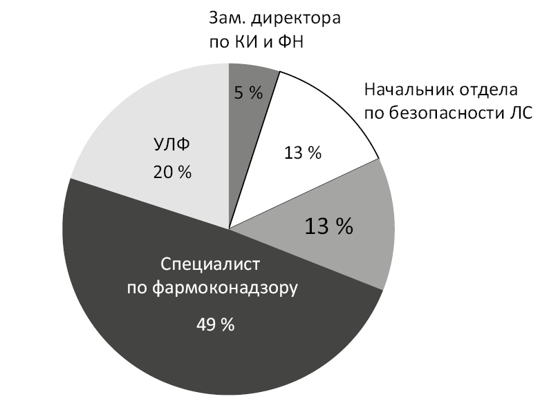 По критерию занимаемой должности среди опрашиваемых были уполномоченные лица по фармаконадзору (УЛФ), помощники УЛФ, рядовые (старшие специалисты) специалисты, руководители отдела, заместители директора (рис 6). Разрез по занимаемым должностям позволяет в дальнейшем сравнить выполняемые задачи и уровень квалификации.