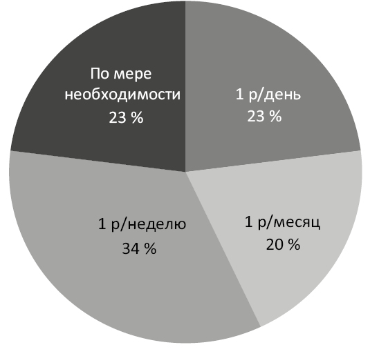 Из 4 предложенных вариантов на вопрос о частоте обращений в процессе повседневной деятельности к основному нормативному документу, регламентирующему деятельность по фармаконадзору на территории Евразийского экономического союза [2], ответы распределились равномерно (рис 7). В любом случае все сотрудники системы фармаконадзора в своей обычной деятельности регулярно обращаются к нормативным правовым документам. Это объясняется тем, что объем информации в системе фармаконадзора достаточно большой, поэтому для недопущения ошибок разумно сверяться с документом.