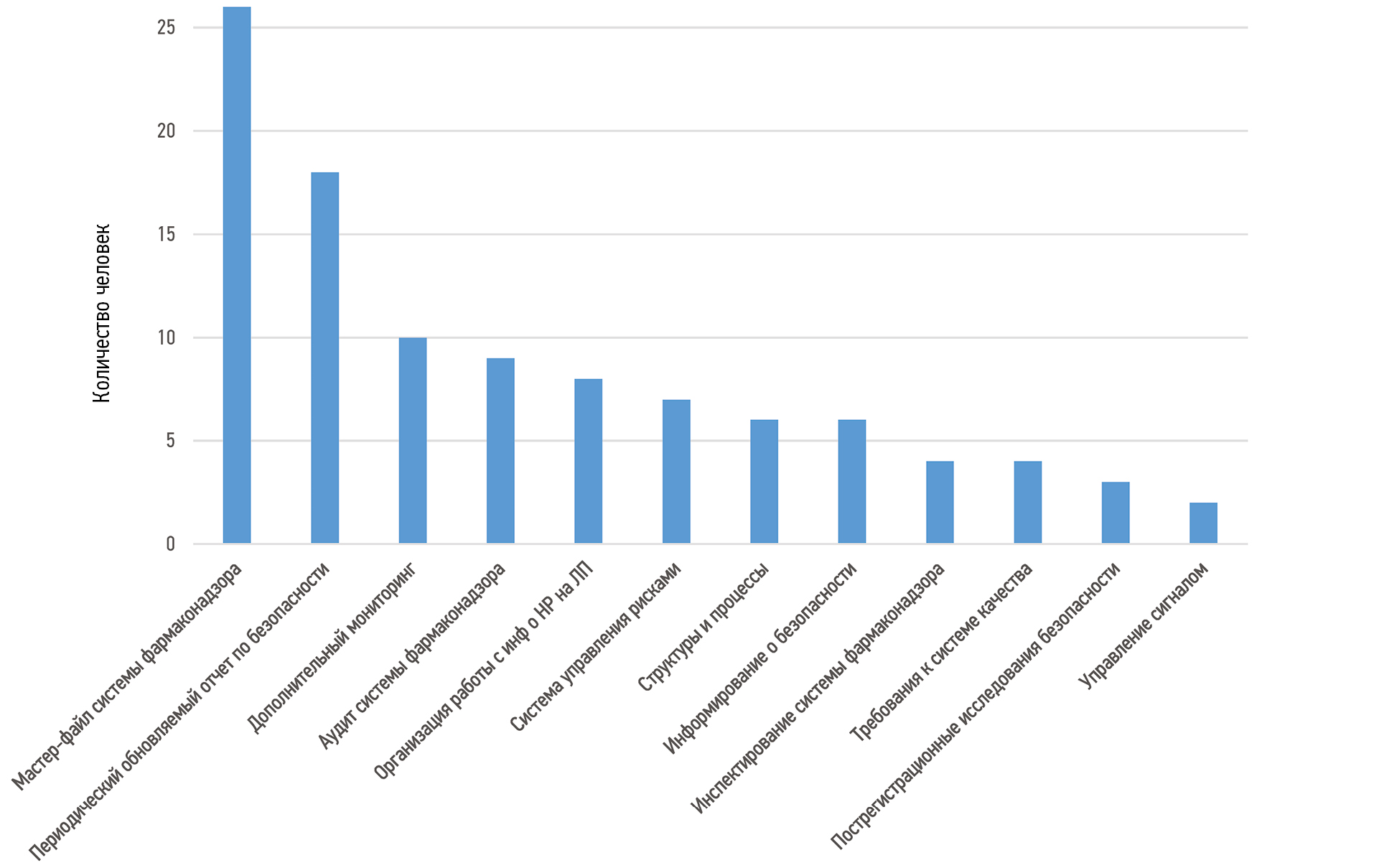 Закономерно ожидать, что каждый из опрашиваемых обращался в повседневной практике к тем разделам документов, выполнение которых входит в его служебные обязанности. В целом на момент сбора информации участники опроса чаще обращаются к разделам «мастер-файл» (40 (67%) ответов) и «периодически обновляемый отчет по безопасности» (27 (46%) ответов), что логично, так как это основные документы по фармаконадзору, регулярно актуализируемые ДРУ. Довольно частое (14 (23%) ответов) обращение к разделу «Аудит системы фармаконадзора» говорит о том, что в организациях ДРУ в последнее время активно проходят внутренние и внешние аудиты, что соответствует требованиям действующего законодательства.