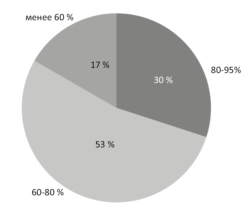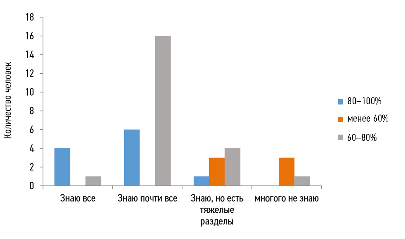 Таким образом, по всем профессиональным вопросам успешно прошли опрос 51 (87%) человек, в том числе 19 (33%) человек набрали более 80 баллов (14–17 правильных ответов), 32 (54%) человека набрали 60–80 баллов (10–13 правильных ответов). 8 (13%) опрошенных показали недостаточно высокие результаты (до 60 баллов — до 10 правильных ответов), рис. 9.